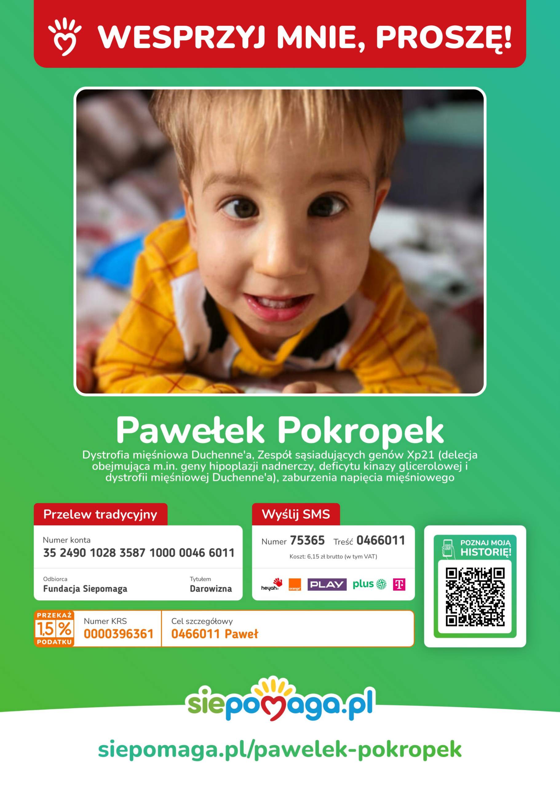 to apel rodziców dwuletniego Pawełka Pokropka, chorego na śmiertelną chorobę – Dystrofię Mięśniową, która prowadzi do postępującego zaniku mięśni i przedwczesnej śmierci.