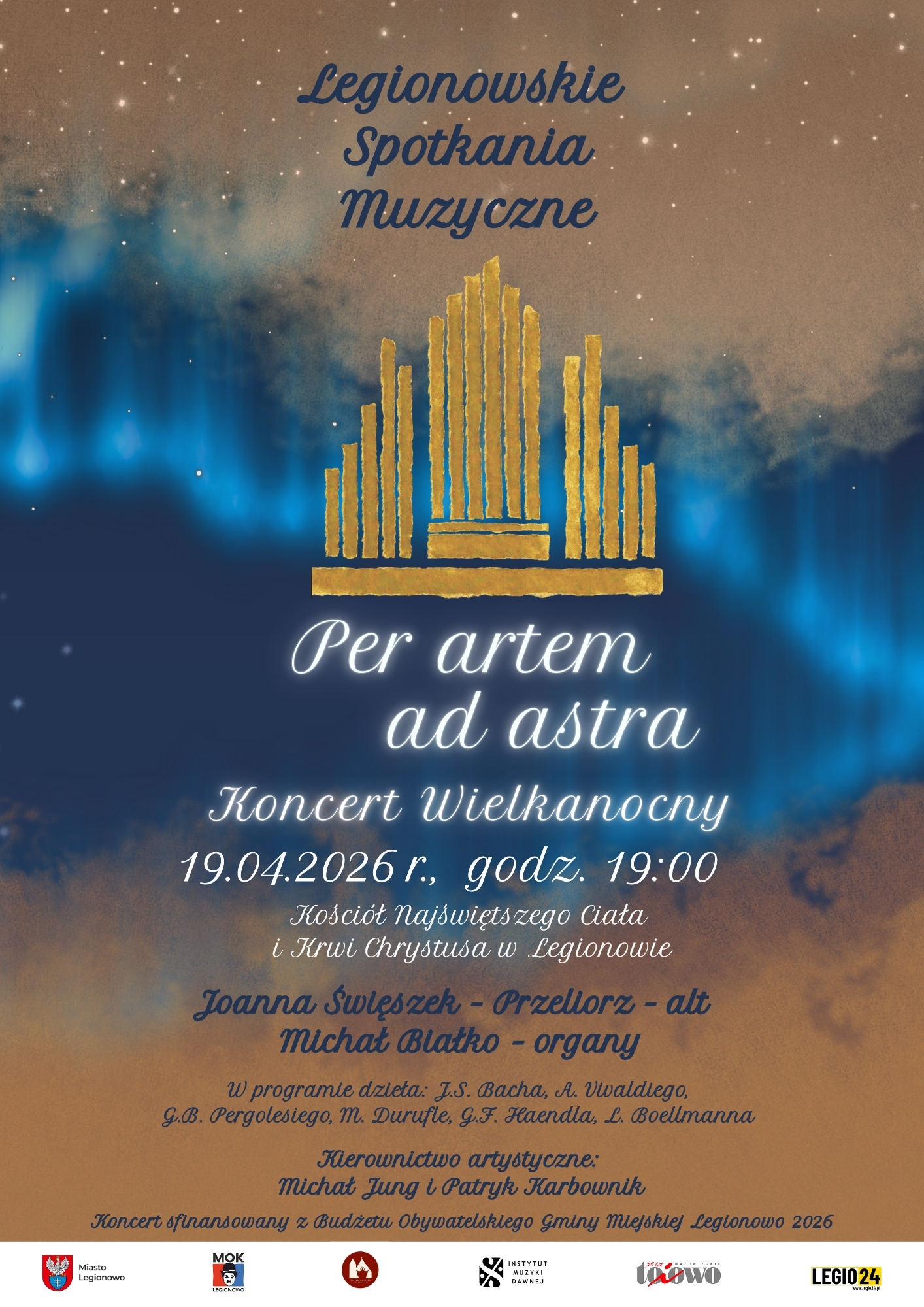 Kolejne wydarzenie w ramach Legionowskich Spotkań Muzycznych „Per artem ad astra”, na które zbieraliśmy podpisy walcząc o pieniądze z budżetu obywatelskiego miasta Legionowo. Zapraszamy na koncert Joanny Święszek-Przeliorz – mezzosopran i Michał Białko – organy będzie w niedzielę 19 kwietnia po Mszy Świętej o godz. 18:00 czyli około 19:00.